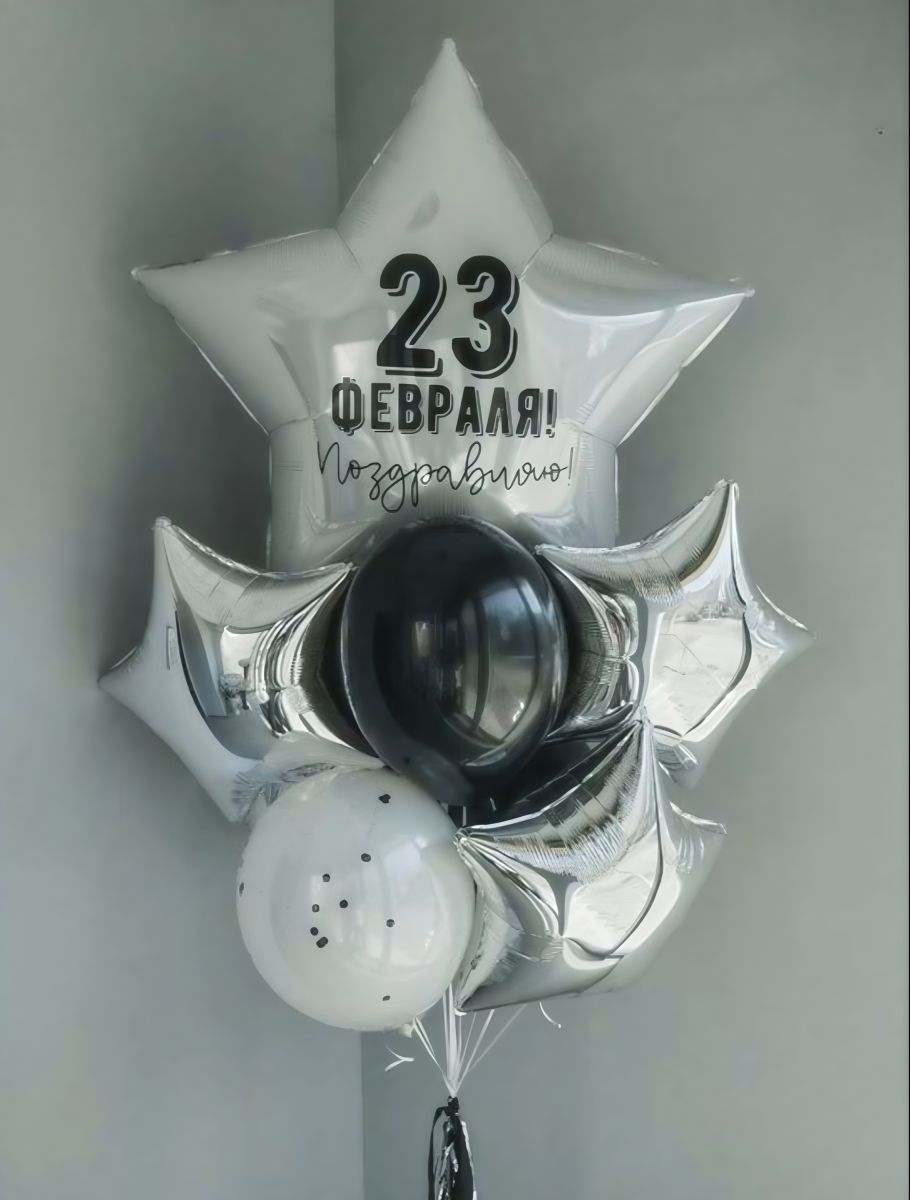Большая связка шаров на 23 февраля(серебро-чёрный)