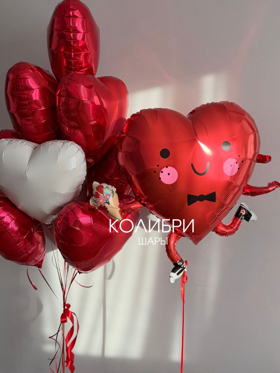 Фольгированный шар Сердце Смайлик + связка из 10 сердец