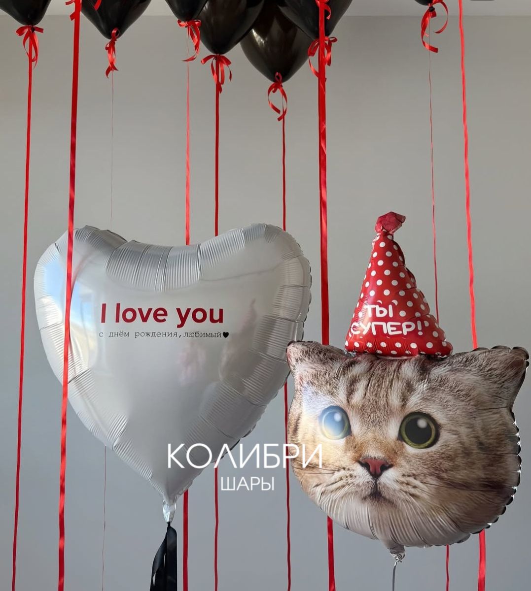 Большое фольгированное сердце с надписью, фольгированный шар Кот, 10 шаров на потолок