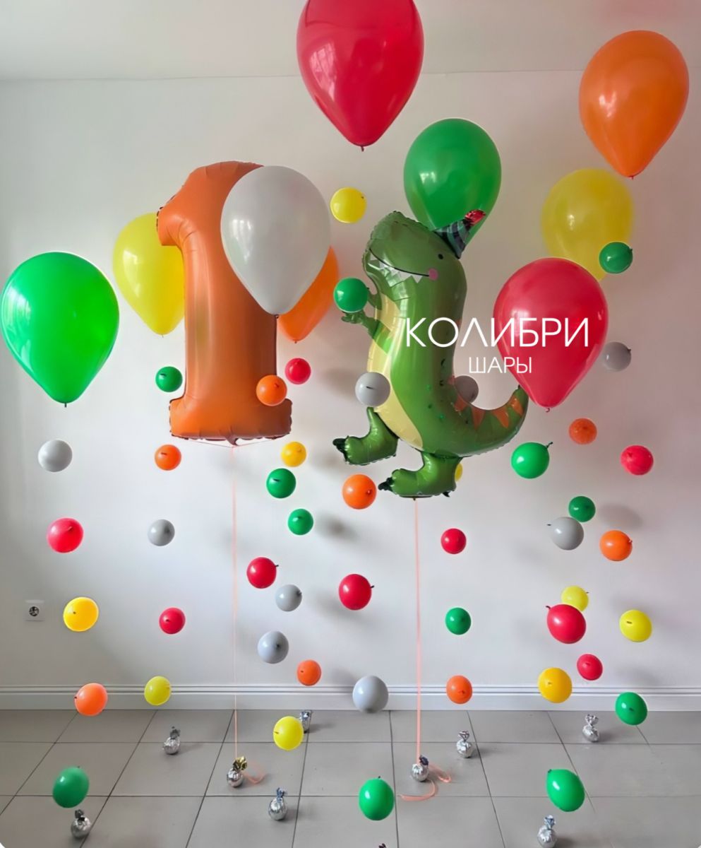 Фольгированный шар цифра, динозавр в колпачке и 9 цепочек из ярких шаров
