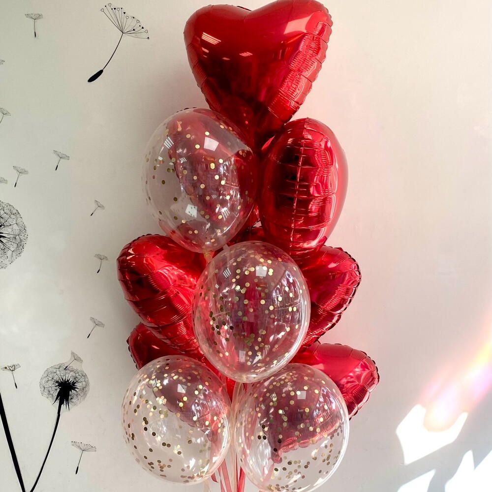Связка из 11 шаров: 7 фольгированных сердец, 4 шара с конфетти